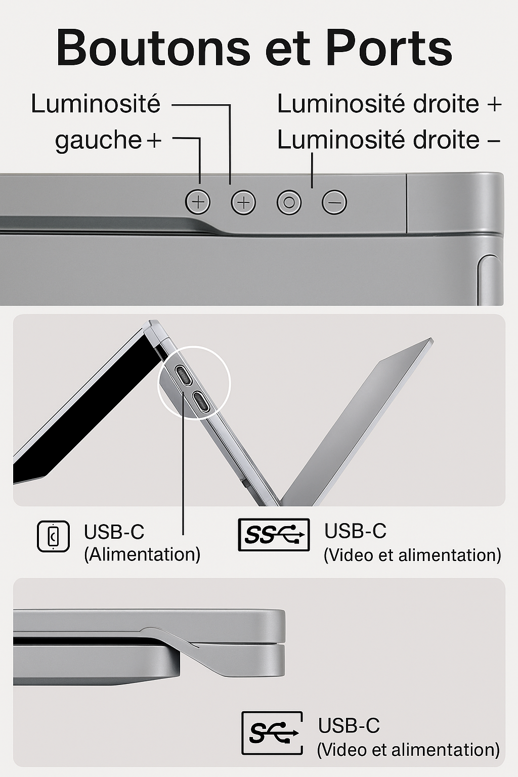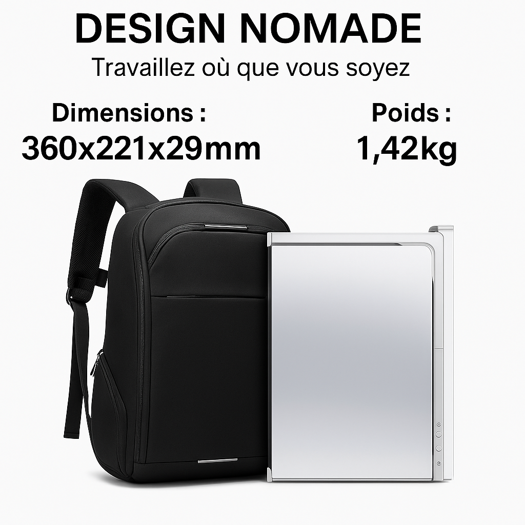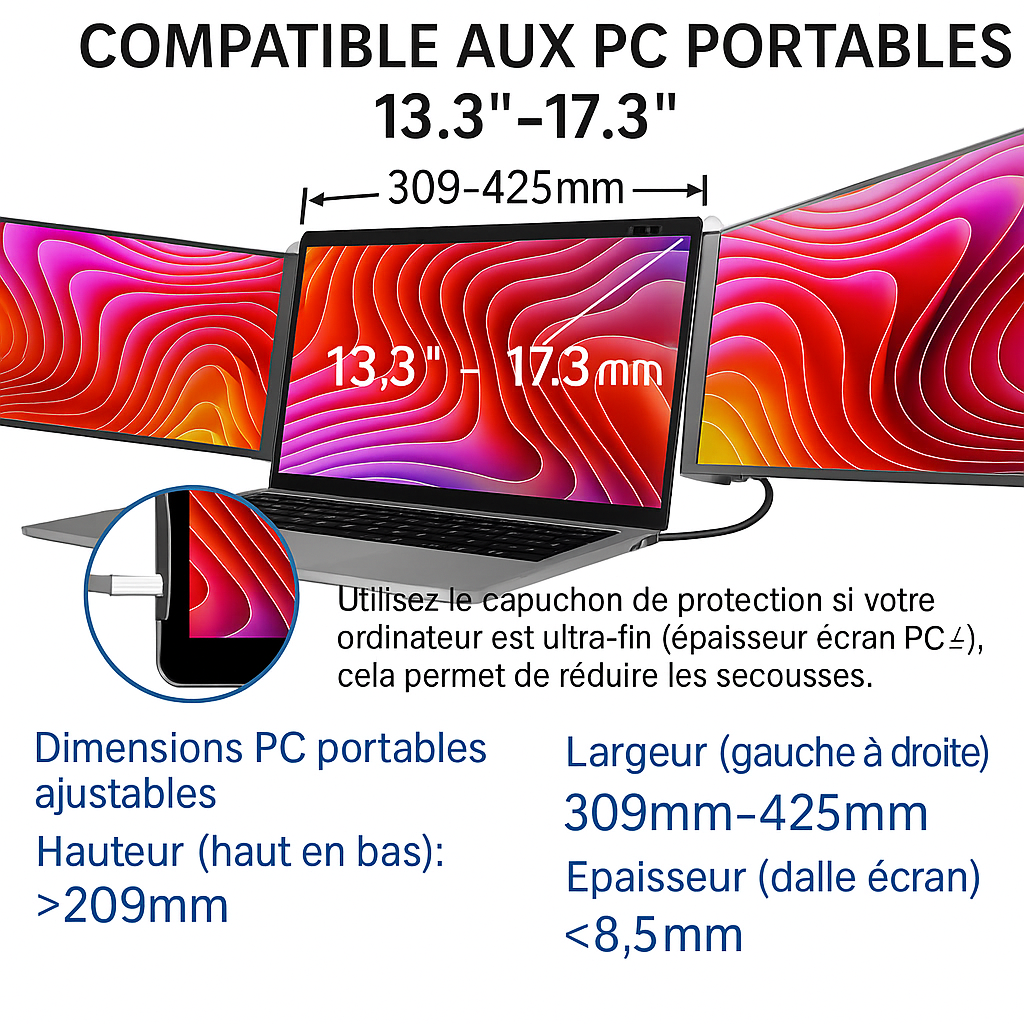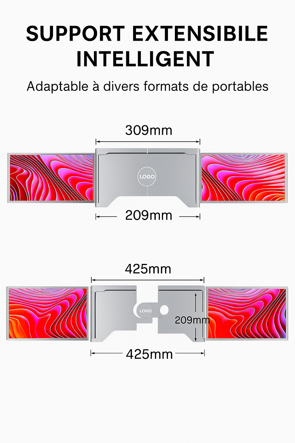 Grâce à son système d'ajustement intelligent, ce double écran s'adapte parfaitement aux ordinateurs portables de 13,3 pouces à 17,3 pouces. Une compatibilité large qui garantit une intégration simple et rapide, sans adaptation complexe.