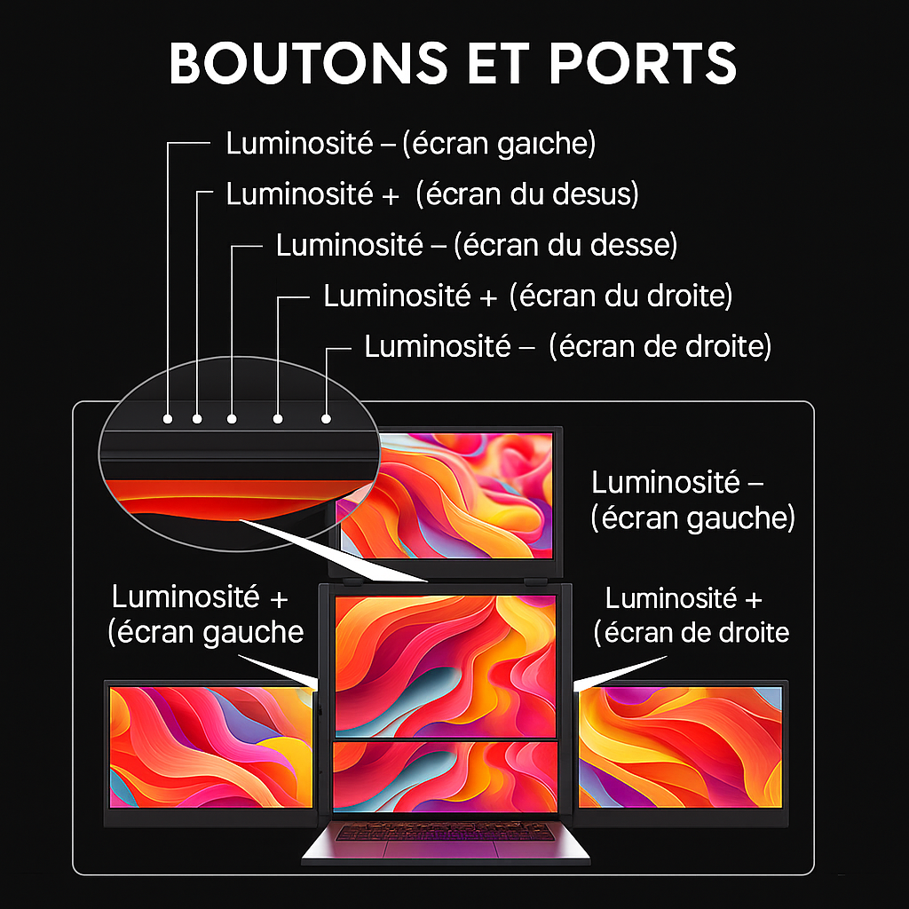 Doté de différent angle de vue l'écran de droite et de gauche à 360° et celui du dessus à 180°, d'une technologie IPS, et facile à installer avec les drivers fournis sur une clé USB, ces écrans sont conçu pour allier performance et simplicité. Ultra transportable, il vous accompagnent facilement dans tous vos déplacements professionnels de travail