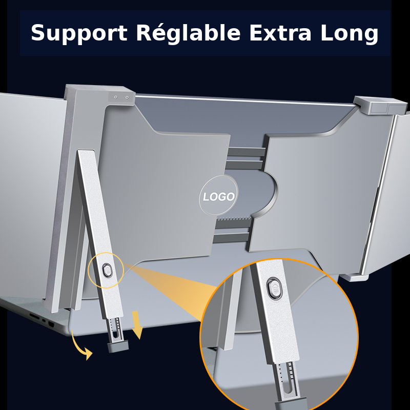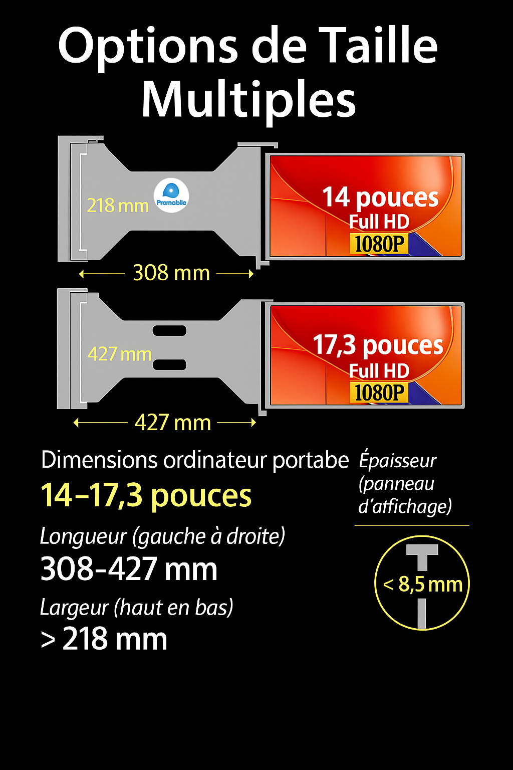 L'écran s'adapte aux ordinateurs portables jusqu' å 427 mm de largeur, garantissant Une compatibilité maximale avec la maiorité des modöles du marché. Grace son support réglable, l'écran peut étre fixé des PC ayant une épaisseur allant iusqu'å 8,5 mm, tout en assurant Une parfaite stabilité.
